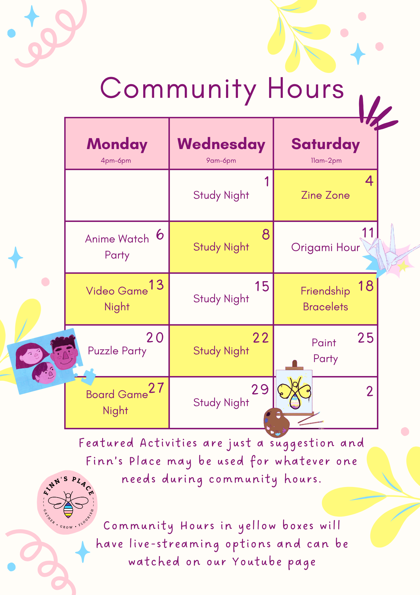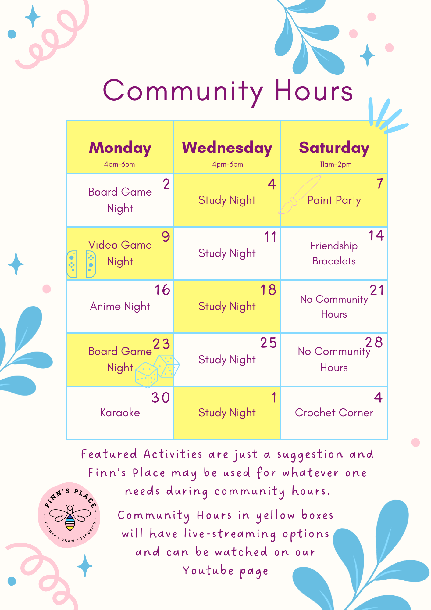 Community Hours are a time for the community to use Finn’s Place. You can do the listed activity or simply use the space as you see fit!
